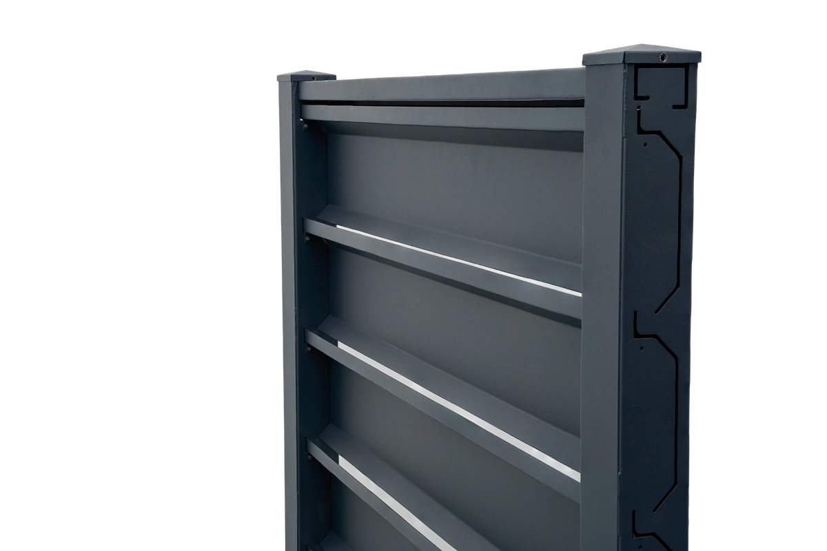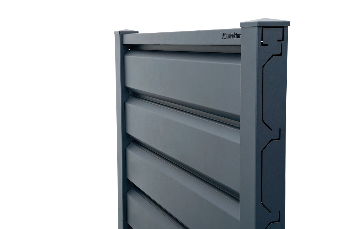 Der kleinere Spalt sorgt für kontrollierte Luftzirkulation und lässt Wind gezielt passieren, während die Fläche von außen homogen und massiv wirkt.
