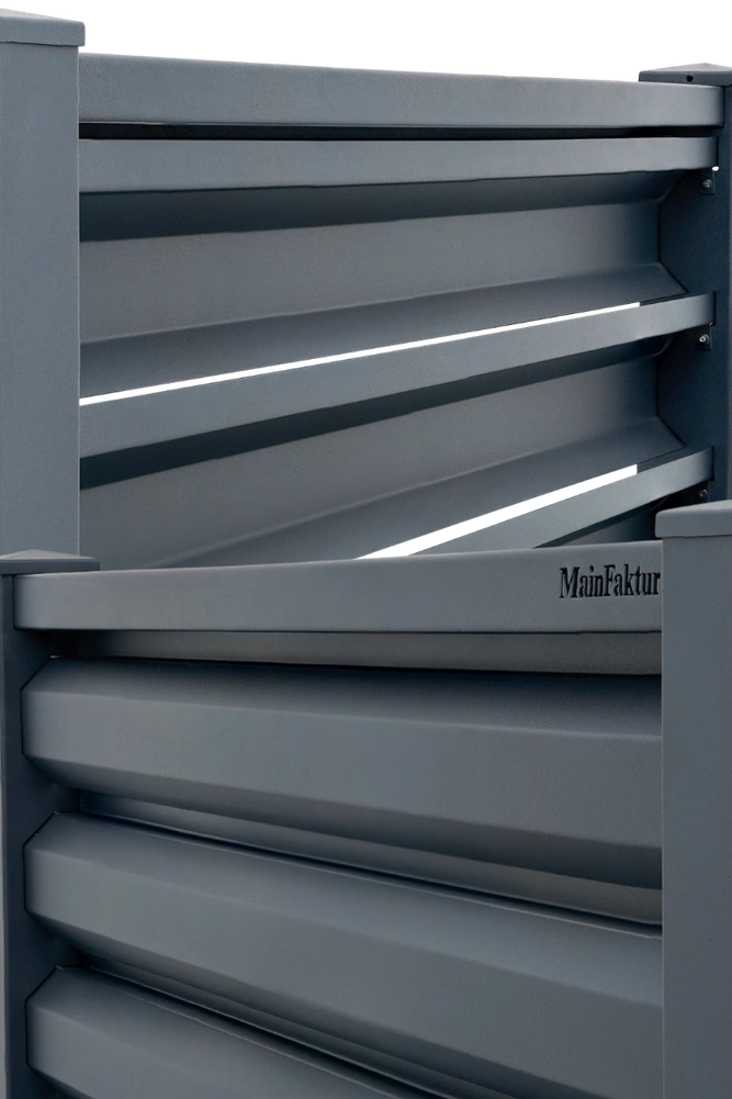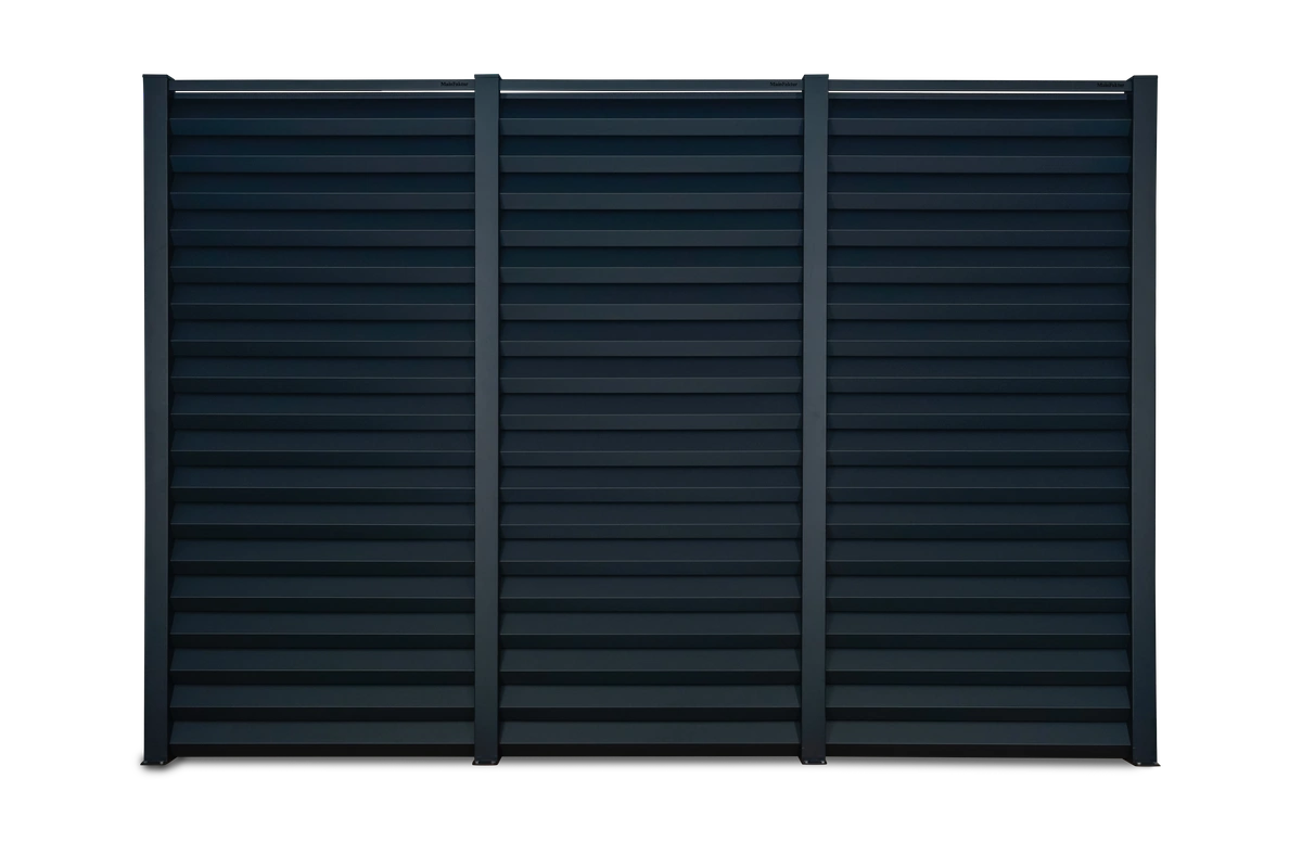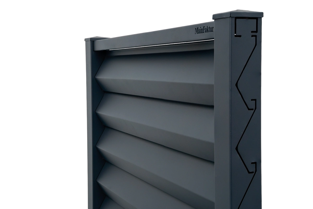 Die markant geformten Paneele schaffen eine kraftvolle Tiefenwirkung und verleihen dem Zaun eine moderne, konzentrierte Präsenz.